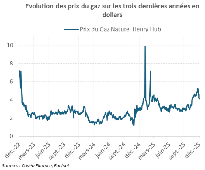 La montée en puissance des bassins de production du Permien et de l’Haynesville a modifié la structure du marché domestique, créant une abondance structurelle de gaz, maintenant donc les prix sous pression. Cette situation a conduit à un découplage durable entre les cours américains (Henry Hub) et ceux observés en Europe (TTF) ou en Asie (JKM). Toutefois, depuis quelques trimestres, la demande nécessaire pour satisfaire les besoins en matière de génération d’électricité est en hausse.