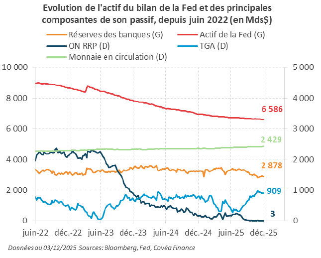 Récemment, certains membres de la Fed se sont montrés favorables à ce que l’institution initie prochainement la gestion des réserves (RMP : Reserves Management Purchase) en augmentant son actif via l’achat de titres. Cela permettrait d'aligner l'offre de réserves sur la croissance naturelles de ses autres passifs (monnaie en circulation et TGA) en ligne avec celle de l'économie. L’objectif serait de maintenir les réserves dans la zone ample et d’éviter les risques de pénurie. Bien qu’il s’agisse d’une croissance de bilan comme dans le cas d’un assouplissement quantitatif, le RMP se distingue par plusieurs éléments. D’abord, c’est un ajustement purement technique accompagné d’une communication de la Fed dans ce sens. De plus, il s’agit généralement d’achats de Bons du Trésor ayant peu d’impact sur la duration du portefeuille de titres. Enfin, le RMP a pour but de mieux ancrer les taux courts dans la fourchette en limitant les pressions haussières et non d’assouplir les conditions de financement. Pour rappel, la Fed avait mis en place un RMP en 2019 alors que le resserrement quantitatif prolongé avait conduit les réserves bancaires au stade de pénurie faisant dérailler le marché monétaire.
