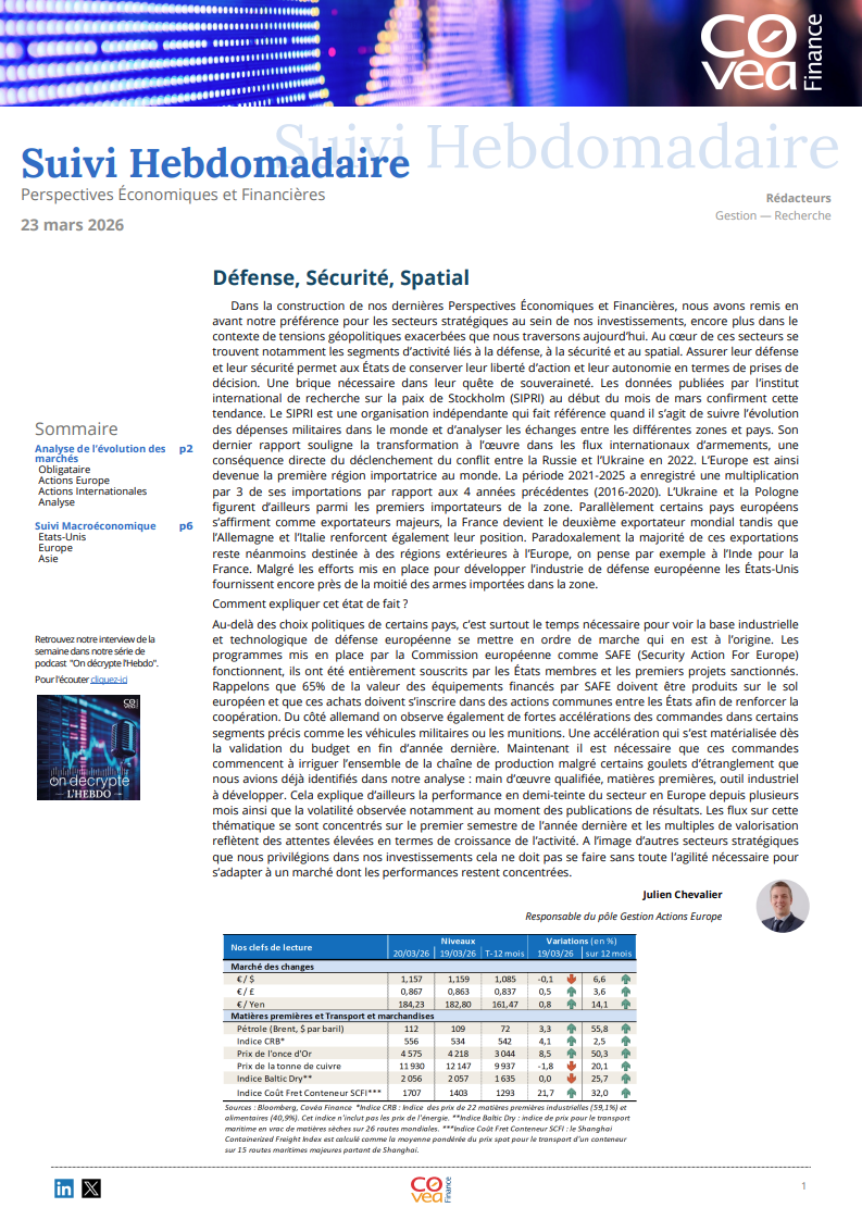 Dans la construction de nos dernières Perspectives économiques et financières, nous avons remis en avant notre préférence pour les secteurs stratégiques au sein de nos investissements, encore plus dans le contexte de tensions géopolitiques exacerbées que nous traversons aujourd’hui. Au cœur de ces secteurs se trouvent notamment les segments d’activité liés à la défense, à la sécurité et au spatial. Assurer leur défense et leur sécurité permet aux États de conserver leur liberté d’action et leur autonomie en termes de prises de décision. Une brique nécessaire dans leur quête de souveraineté.