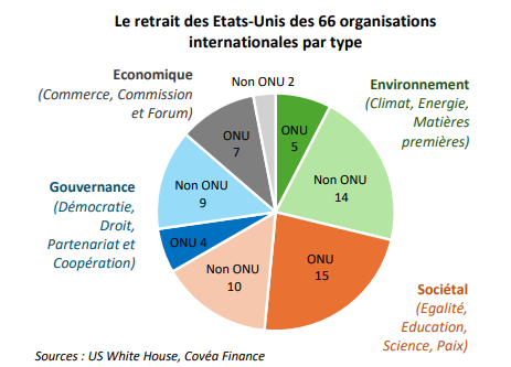 En effet, ce désengagement n’est pas total, mais cible des domaines régulièrement dénoncés par la Maison Blanche, à savoir l’environnement (GIEC, Agence Internationale des Énergies Renouvelables, Convention cadre des Nations Unies sur le Changement Climatique…), les questions sociales (UN Femmes, UN Habitat, le Fonds pour la Population…), économiques (CNUCED, International Trade Center…) voire même des organisations faisant la promotion de la démocratie, de la paix ou du droit international (Fonds et Commission pour la Paix, Fonds pour la Démocratie, Commission du droit international…).