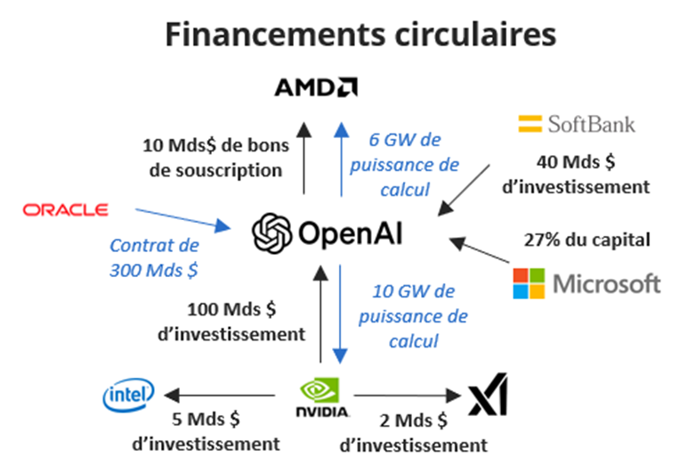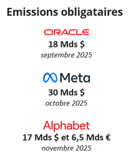 Sur les douze derniers mois, les principaux acteurs de l’infrastructure informatique Cloud ont investi des montants très importants, près de 400Mds$. Cette dynamique de dépenses continue d’accélérer avec l’annonce en septembre du contrat entre Oracle et OpenAi pour 300 Mds $, avec de nouvelles hausses prévues par les principaux acteurs américains (Microsoft, Meta, Oracle, Alphabet, Amazon) pour 2026.